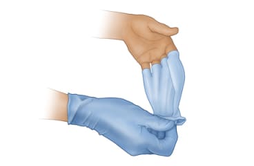 Use this method to take off disposable gloves, so that any soiled material or germs stay away from your hands.