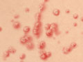 - Chickenpox (varicella). This starts as red bumps that turn into blisters and then scab over.