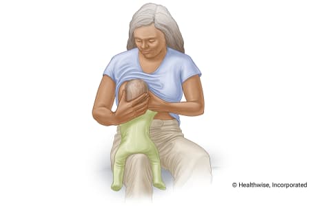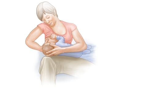 In the Australian hold, your baby is held vertically and straddles your thigh, facing you. Your knee supports your baby's bottom, while one hand is low on the baby's head to give control as you bring your baby to the breast to latch. The other hand (on the side opposite from the breast being used) supports and narrows the breast to help the baby form a good, deep latch on the areola.