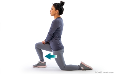 Keeping your back straight, slowly push your hips forward. You should feel a stretch in the upper thigh of your back leg and hip.