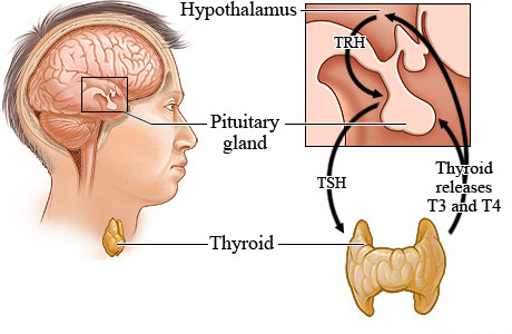 The thyroid gland produces two thyroid hormones, triiodothyronine (T3) and thyroxine (T4), and releases them as needed by the body. The hypothalamus and the pituitary gland help control the thyroid gland. The hypothalamus produces thyrotropin-releasing hormone (TRH), which stimulates the pituitary gland to release thyroid-stimulating hormone (TSH). A low level of T3 tells the hypothalamus to release more TRH, and it tells the pituitary to release more TSH. The thyroid gland releases T3 and T4 until the body is receiving the required amount.