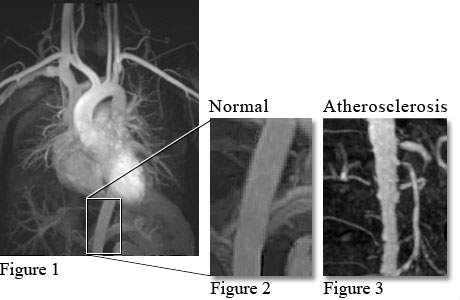 Figure 3 shows an MRA of a narrowed and abnormal aorta from the buildup of calcium and fat (cholesterol) in the inner lining of the artery, often called "hardening of the arteries" (atherosclerosis).
